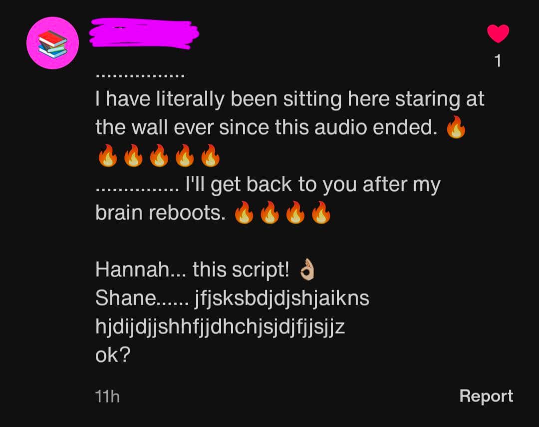I know it might seem like writing audio erotica scripts is all fun and boning, but it's really a lot to balance, and it's unique in terms of the format to capture a two-way dialogue when you only hear one side of it. You have to manage pacing, flow, logistics, plausibility, natural dialogue, backstory (without infodumping or "as you know, Bob"-ing), sound effects cues, tone cues, the age-old "where are their hands!?" conundrum, responses that make it clear what was said without hearing it, how many times the word fuck is acceptable... spoiler alert: